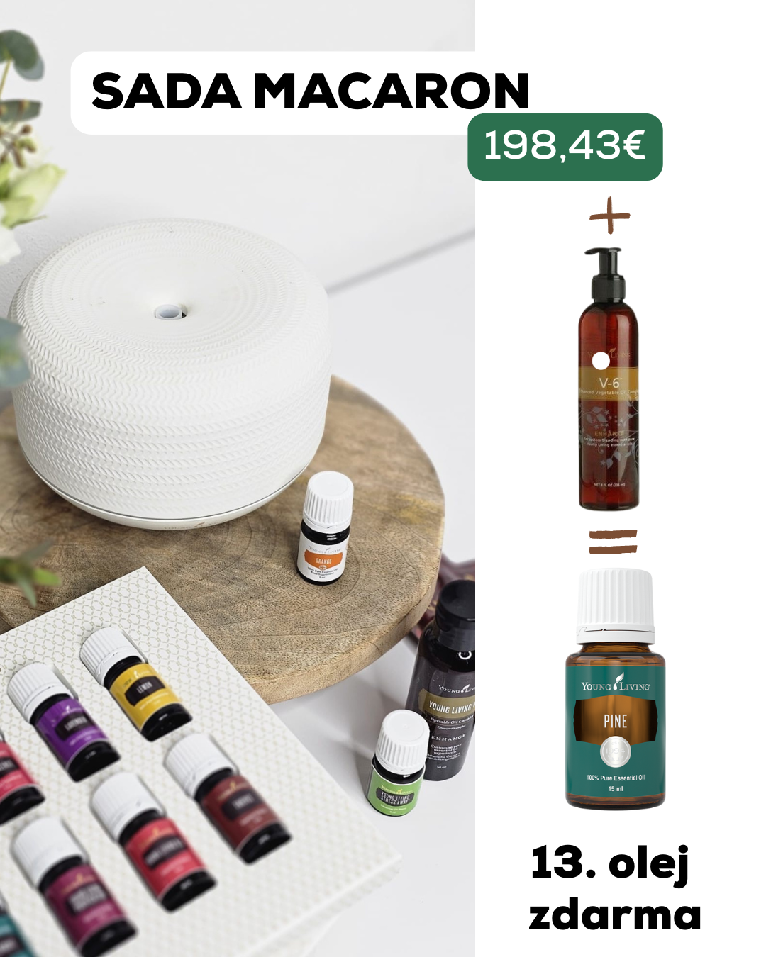 Můj tip je rozhodně startovací sada s difuzérem Macaron, je bezdrátový a pokryje velké plochy. Pokud navíc objednáš přes Věrnostní odměny (nemusíš objednávat měsíčně) a přidáš V-6 nosný olej na ředění, dostaneš olej Pine 15 ml ZDARMA a 10 % zpět.